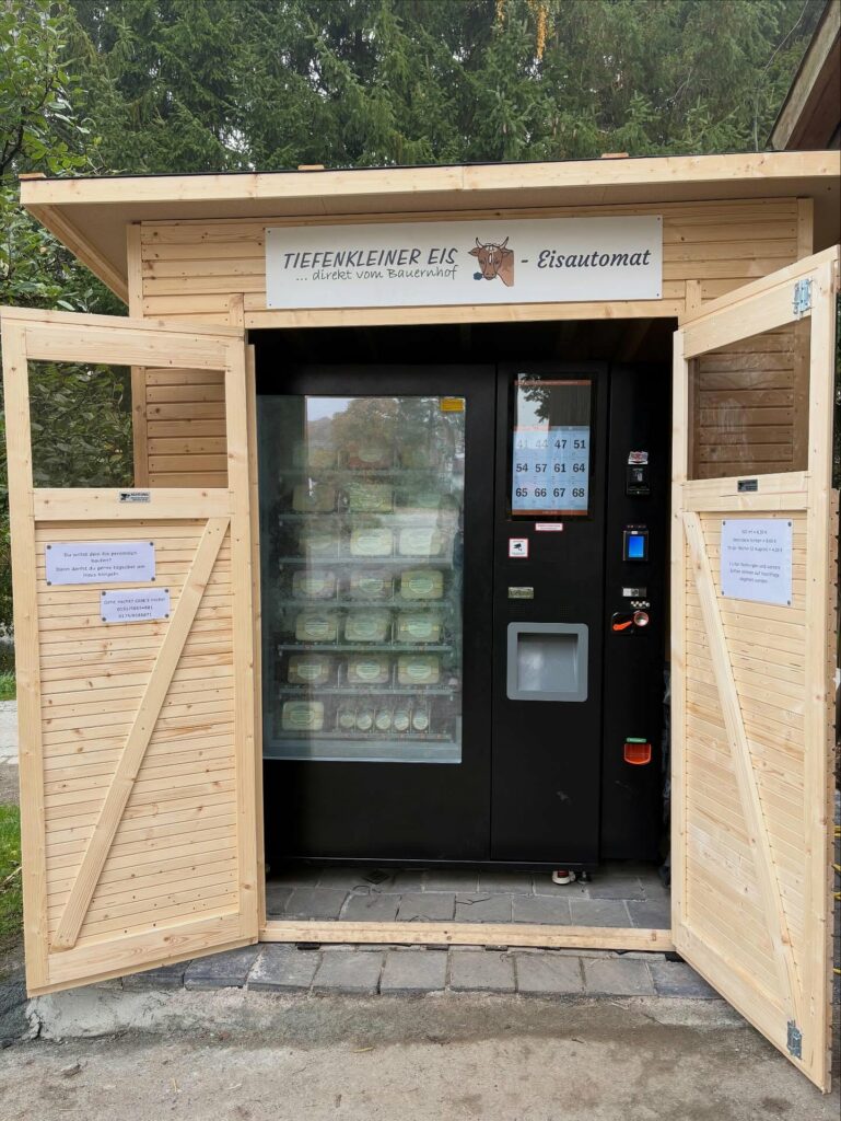 Endlich ist es soweit! Unser Eisautomat ist da! Ab sofort gibts hier 24/7 unsere 500 ml – Familienpackungen und die kleinen to go Eisbecher (2 Kugeln) mit Löffel im Deckel!